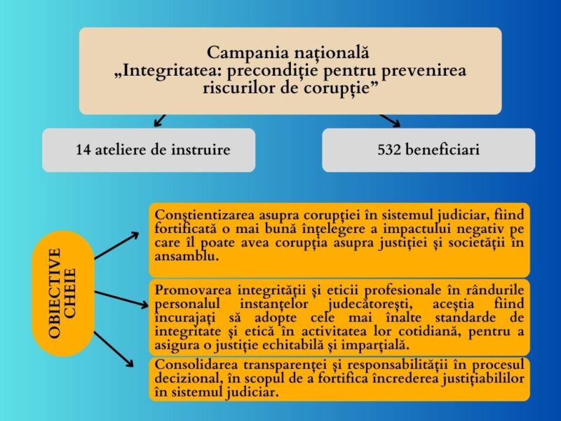 Lansată cu scopul de a consolida, promova și fortifica valorile integrității, campania națională a reprezentat o platformă esențială de informare, educare și implicare a personalului judecătoresc în procesul de promovare a unui sistem judiciar transparent, etic și imparțial.